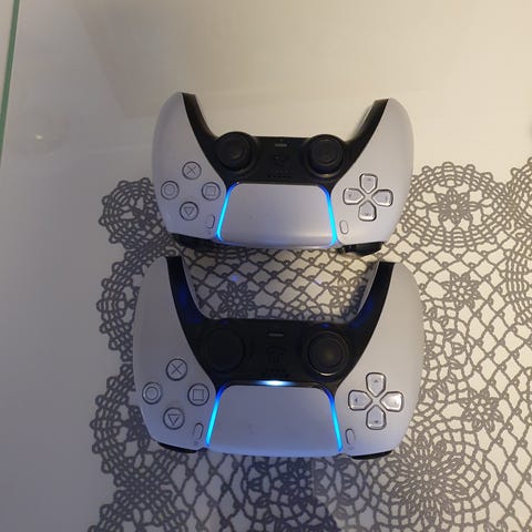 Playstation 5 spillkonsoll med standard design i hvit og svart farge. Konsollen har integrert kontroller og skjerm, egnet for videospill.