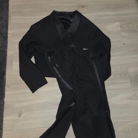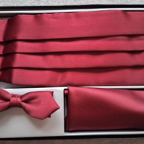 Burgunderrødt sett til smoking (magebelte, sløyfe og pyntelommetørkle). One size. Polyester. Brukt et par ganger. Ingen flekker det jeg kan se, men en tråd på magebelte som er "rynket".