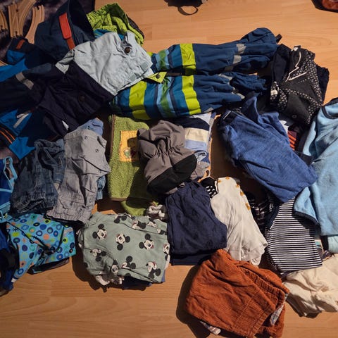 Pakken inneholder bodier, gensere, bukser, pysjer, shortser, T-skjorter, sparkebukser, sokker, luer, fleecejakke, onepiece, uv-drakt m/lue og tøfler
