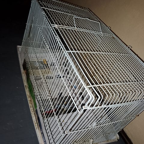 Fugl bur laget av bambus med en rund form og en hengende krok i metall. Buret inneholder en hvit dekorativ fugl og har en naturlig trefarge. Egnet som dekorasjon.