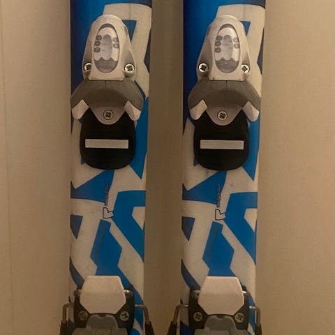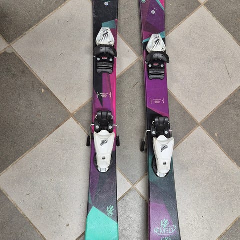 K2 indy alpinski (100 cm) med tilhørende støvler. Skiene har et mønster i svart og hvitt, og støvlene er hvite med justeringsmuligheter (str 20,5).