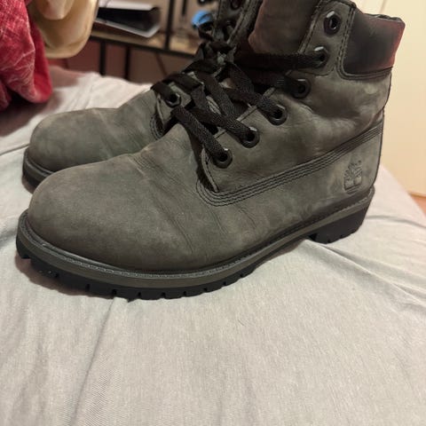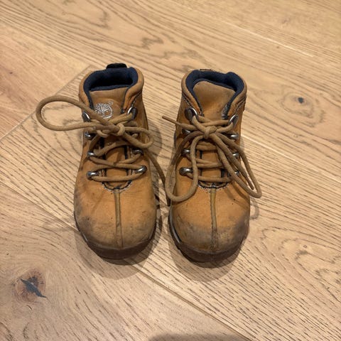 Gode, høye Timberland vinterstøvler i lys brunt skinn og med snøring. Vinterstøvlene er godt brukt, men med en vask og en runde fett kommer de å se fine ut. Det er fortsatt mye bruk igjen.