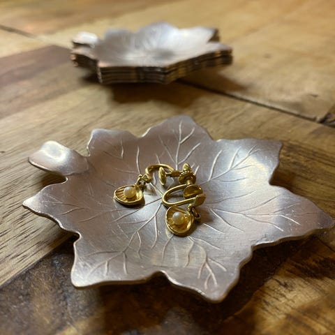 Selger en liten vintage bladformet messingskål. Naturlig patina og bruksmerker kan forekomme.