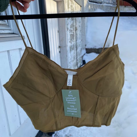 Silkeaktig materiale, men hva materialet faktisk er ver jeg ikke ettersom lappen ikke er på. Så vet heller ikke merket. Men oppleves av god kvalitet