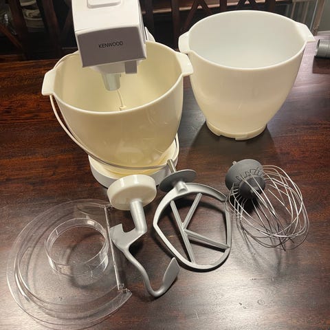 Kenwood kjøkkenmaskin med bolle i rustfritt stål og flere tilbehør inkludert visp, eltekrok, og kjøttkvern. Maskinen har justerbar hastighetskontroll og en ekstra stor plastbolle for miksing. Egnet for ulike kjøkkenoppgaver som baking, miksing og kjøttkverning.