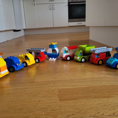 LEGO DUPLO Annet lekesett som inkluderer flere kjøretøy som gravemaskin, helikopter, fly og båt. Settet er laget for små barn med fargerike og solide deler tilpasset tidlig lek og motorisk utvikling.