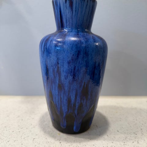 Goebel Mara vase. Vasen har et rektangulært form med gullfargede og fargerike detaljer, inkludert månemotiv og geometriske mønstre. Laget i keramikk, egnet som dekorativ gjenstand i hjemmet.