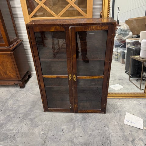 Rustikk veggskap med to glassdører. Pent, laget av tre med jernbeslag.
