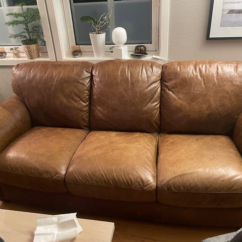Hvitt skinn sofa , godt brukt, ingen hul, men slitt i noen områder. Fungerer utmerket. Ingen feil.
