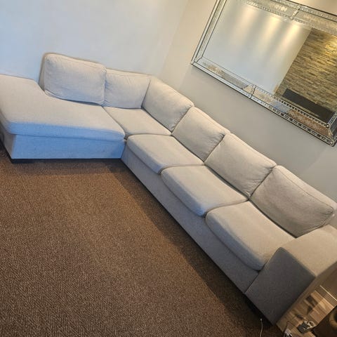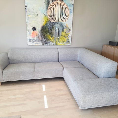 Selger en Bolia Scandinavia hjørnesofa i grått stoff, med tilhørende puff og stålbein, grunnet flytting. Sofaen er i strøken tilstand og brukt under et halvt år, profesjonelt renset ganske nylig og uten flekker, skader eller synlig slitasje.