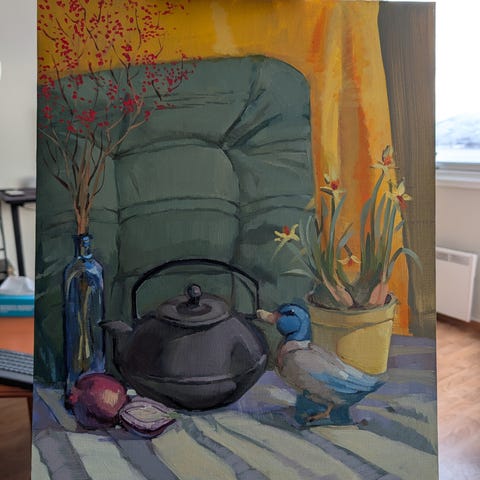 Maleri av tekjele og to sitroner. Hvilken stemning gir det deg?