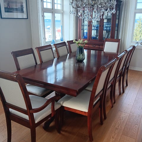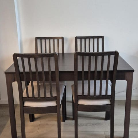 Selger spisegruppe : et bord og 4 stoler fra Ikea sammen. Bordet kan være både for 4 og og 8 personer. Må hentes i 2.etasje uten heis.