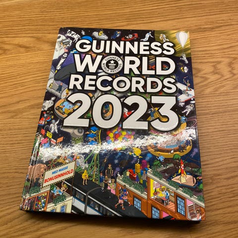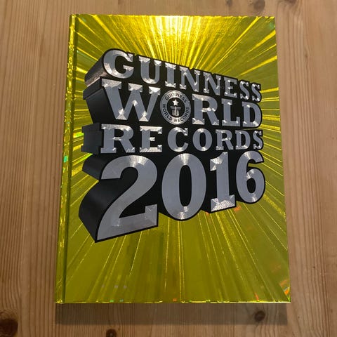 Guinness World Records 2016 bok med gyllent omslag. Inneholder rekordoppføringer og fakta fra 2016.