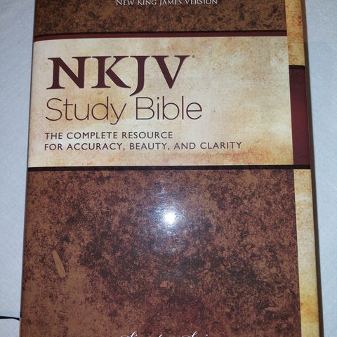 The Zondervan KJV Study Bible, storskriftutgave, stivperm. Innbinding: limt (ikke sydd). "Red Letter" (words of Christ in red). Over 2900 sider totalt. Studie bibel med forklaringer/fortolkninger til teksten i fotnoter, historiske opplysninger, ord-definisjoner, innledninger til hver bok i Bibelen, bibel-kronologi, evangelie-harmoni, Index, Concordance, "in-text maps", "charts", etc. Bakerst finnes 16 fargerike kart med detaljopplysninger om steder og hendelser. KJV teksten er en "full feature" original King James tekst med "center-column references" (kryssreferanser) inkludert grunntekst- og oversettelses-noter fra KJV oversetterne av 1611. Men det som gjør akkurat denne utgaven unik, er at både KJV-teksten og marg-notene er en reproduksjon av F.H.A. Scrivener's "Cambridge Paragraph Bible" fra 1873, den siste "standardiseringen" av KJV-teksten og notene, som innebærer noen små-endringer i forhold til den originale 1611-utgaven. (Omtrent alle andre KJV bibler og studie-bibler i omløp idag er basert på Oxford utgaven til Blayney fra 1769, som regnes for å være standard utgaven av KJV). -- Det ble solgt veldig mange eks. av denne Zondervan studie-bibelen, så det mangler ikke på tilgjengelighet på nettsteder, men oftest er de gradert til "acceptable", "good" eller "very good", mens mitt eks. ikke har noen bruks-slitasje. I tillegg er dette "large print" utgaven som det ikke finnes fullt så mange av. Prisen jeg har satt på denne (400,-) skal være en rimelig pris for et "large print" eks. som er "som ny"...
