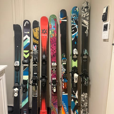 Selger K2 ObSETHed-skiene med marker-bindinger. som kan brukes både med vanlige alpinstøvler og toppturstøvel.