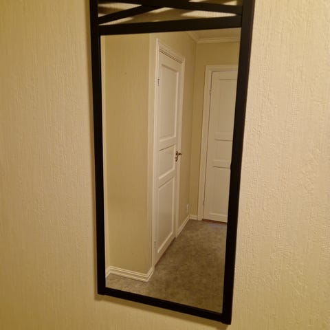 Speil med dekorativ ramme i farger som inkluderer svart og beige. Speilet har en rektangulær form og kan brukes til innendørs dekorasjon og funksjon.