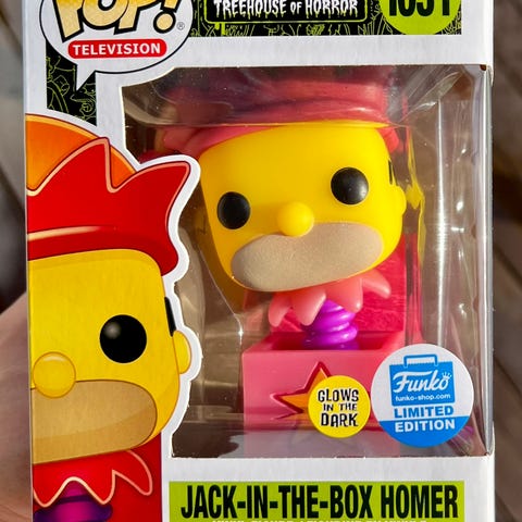Funko Pop! The Simpsons Homer Simpson figurine i gul farge. Figuren viser Homer Simpson med hvit skjorte og blå bukser, holdende en gjenstand i hånden.