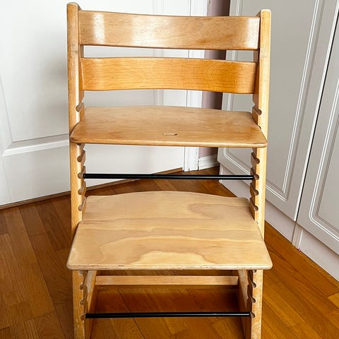 Stokke barnestol av ny modell. Passer newborn seat. I lyst tre (ser mørkere ut på bildene enn den er i virkeligheten). Følger med bøyle, mangler ryggstøtte.