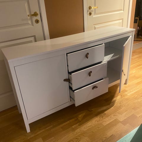 Solid heltre skjenk, opprinnelig blå-beiset men nå falmet. Bør pusses og beises.