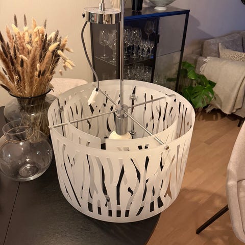 Lampen har et elegant og organisk gress-inspirert mønster som gir et behagelig og stemningsfullt lys. Det rene skandinaviske designet passer perfekt over spisebord, i stue, gang eller soverom.