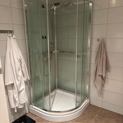 Dusjkabinett med glassdører og krom armatur. Egnet for baderom med begrenset plass. Inkluderer dusjarmatur med termostat og hånddusj. Designet for enkel montering og rengjøring. Størrelse 80 x 80 cm.