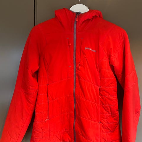 Selger en blålilla skalljakke/skijakke fra Patagonia. Størrelse M. Normal passform. Snøskjørt og mange praktiske lommer. Mulighet for lufting under ermene. Hette.