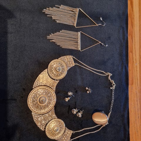 Vakkert vintage smykkesett i filigranarbeid, bestående av armbånd og matchende anheng med kjede.