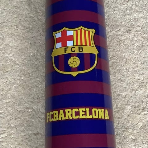 FC Barcelona gjenbrukbar vannflaske med seks utskiftbare merker. Flaske laget for å kunne fylles med vann og tilpasses ved å velge og sette inn ønsket merke. Produktet er produsert i Norge og designet for enkel bruk og variasjon i utseende.