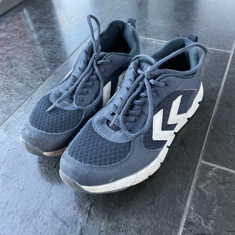 Hummel håndball-sko størrelse 35 i blå og hvit farge. Skoene er designet for annet sportstype og har en kombinasjon av mesh og syntetiske materialer for ventilasjon og komfort.