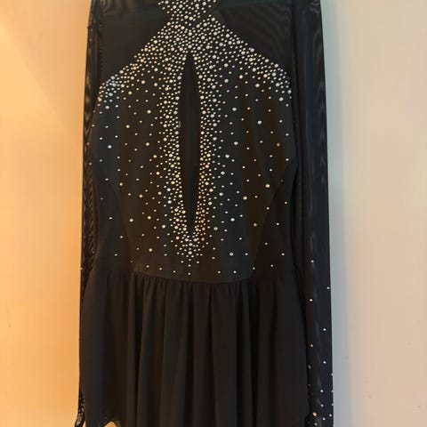 Kunstløpsdrakt i blå farge med paljettdetaljer. Drakten har lange ermer i gjennomsiktig materiale med paljetter. Designet med dekorative mønstre og skjørt i samme blåfarge. Brukt en sesong og kan fint brukes flere
