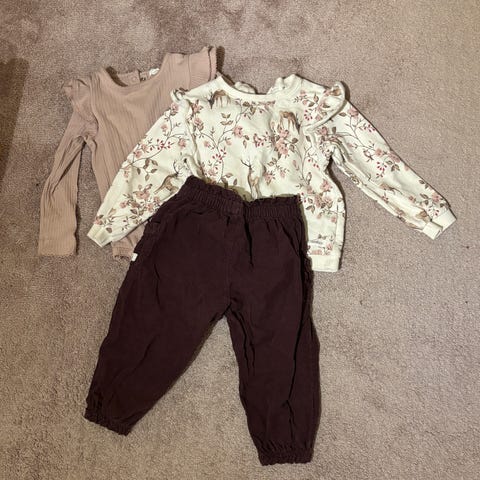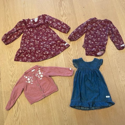 Nydelig kjole med blomsterdetaljer, genser med fugler, romper med blondedetaljer, body med blondekrage (litt misfarget på ermene) og genser med søte blomster. Fra dyre- og røykfritt hjem.