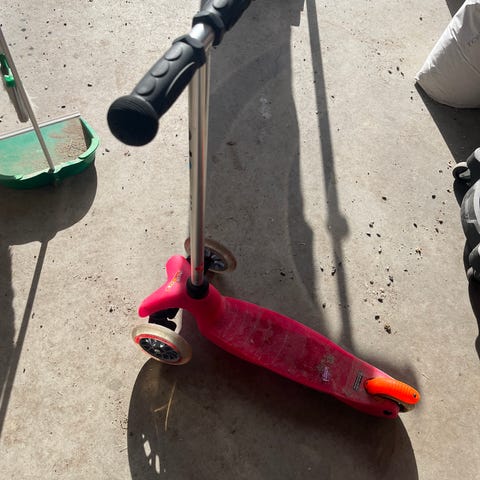 sparkesykkel i fargene hvit og grønn. Sparkesykkelen har et robust design med brems og håndtak. Egnet for barn og unge til utendørs bruk.