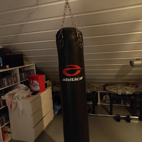 Abilica boksesekk i svart farge - 120 cm. Egnet for trening innen boksing og kampsport. Laget av slitesterkt materiale for å tåle slag og spark. Pent brukt, kun enkelte kosmetiske bruksmerker (se bilde). Ett par boksehansker følger med.