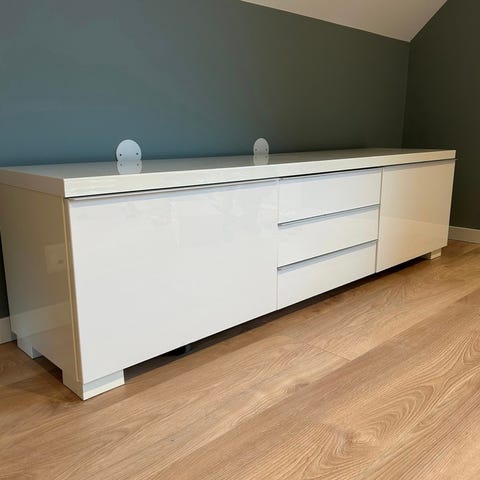 Selger en fin hvit høy-glans tv-benk 180cm. Kjøpt ny for 4-5 år siden. Mener jeg kjøpte den på jysk, men finner ikke link. Isåfall kan det være IKEA.