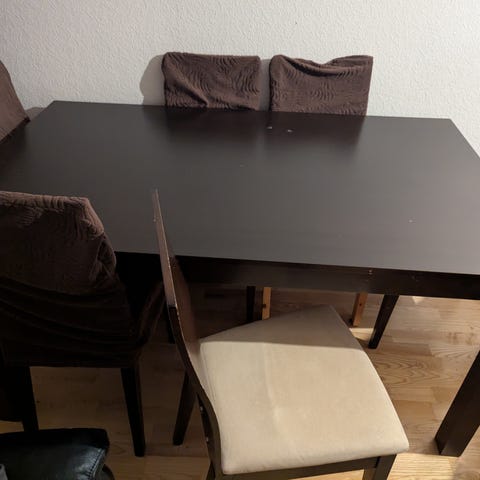 Pent og solid spisebord med tilhørende stoler. Følger med to ileggsplater slik at bordet kan bli opp mot 3 meter. Selges billig grunnet flytting. Den ene stolen har en liten skade, som vist på bildet☺️