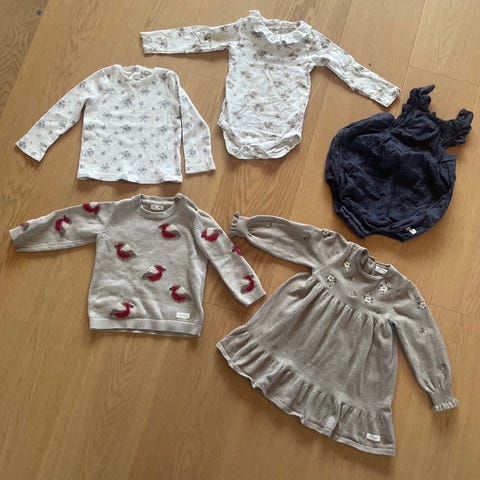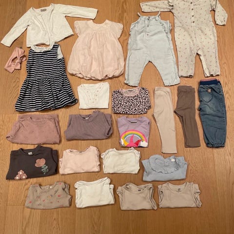 Klespakke med 23 plagg, str. 86. Pent brukte klær (den gule bodyen har et lite hull ved den ene trykknappen, og noen flekker på den ene skjorta) fra H&M, KappAhl, Zara, Lindex, Molo og Name It. Fra dyre- og røykfritt hjem.
