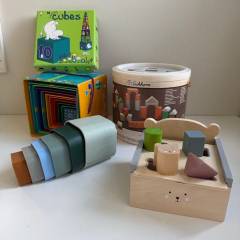 Lekesett the inspector i god stand, med normal bruksslitasje. Settet er komplett, med unntak av den minste koppen i stablesettet som er sporløst borte 😊 Bilbane fra Lovevery medfølger, se bilde av en liten skade i treverket.