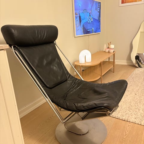Selger en InterDane stol designet av Oluf Lund. Stolen er noen år gammel, men fremstår som svært pent brukt uten synlig bruksslitasje. Dette er en tidløs og moderne designstol som passer like godt i stue, kontor eller loungeområde.