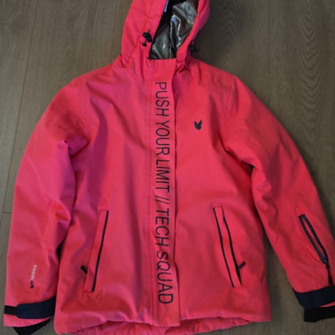 North Peak skijakke og skibukse for barn i rosa og grå. Jakken har hette og snølås, er laget med fullt forseglede sømmer, vannsøyle 10.000, vindtett og pustende stoff. Skibuksen har justerbare seler og elastisk midje for bedre passform. Str 10 år 140-146