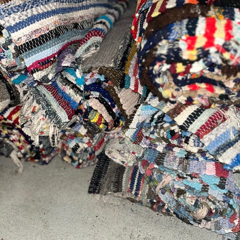 Twill-aktig, litt elastisk stoff. Trolig polyester. Har et litt tungt fall, så det vil passe ypperlig til bukser eller skjørt