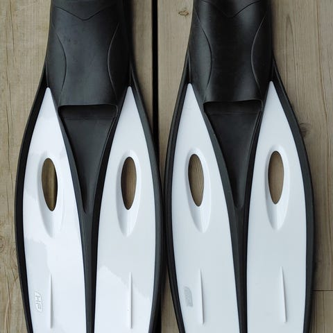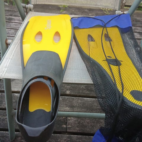 Klubben svømmeføtter i rød farge. Laget for bruk ved svømming og trening i vann. Korte blad. I god stand.
