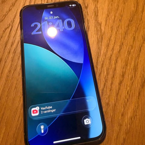 Apple iPhone 12 med 64 GB lagringskapasitet. Telefonen har en blå farge og kommer med etui. Batterikapasiteten er målt til 85 %, og enheten har iOS-operativsystem.