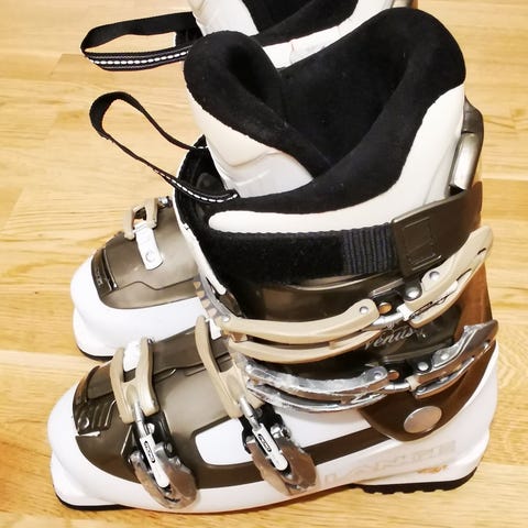 Nordica firearrow alpinstøvler i rød og svart farge. Støvlene har flere spenner for justering og er designet for alpint bruk.