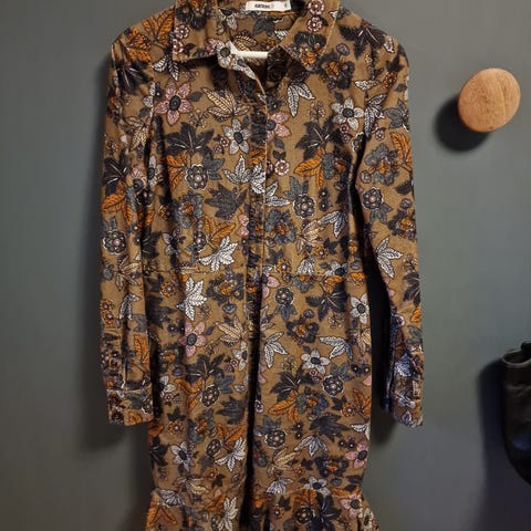 Katrin Uri kjole i størrelse 42 for kvinner. Kjolen har flerfarget mønster i høstfarger og er laget av viskosemateriale som faller tungt og pent. Foret. Den har lange ermer og lukkes med glidelås bak. Figursydd, men ikke ettersittende. Lengde rett under kneet. Lite og pent brukt, så er i god stand.