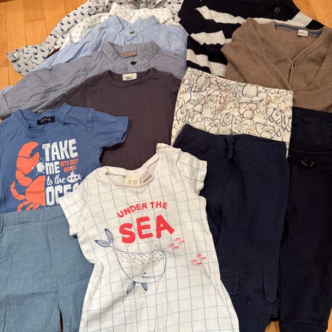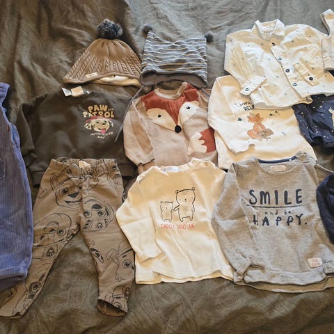 Selger en klespakke med fem bodyer og fem bukser og tre pysjer fra forskjellige merker: Wheat, Newbie, Lindex, Cubus og HM. Fine klær som er pent brukt.