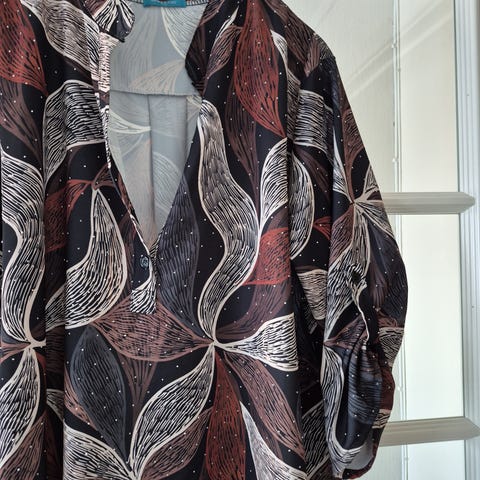 Stilig bluse fra Zara i størrelse XL med svart og hvit mønstret design selges for kr. 200,-. Den ble dessverre litt for liten til meg. Blusen har lange ermer og en høy hals, laget av lett stoff.