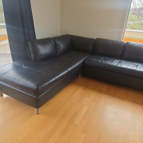 Stor hjørnesofa i sort skinn – romslig og komfortabel