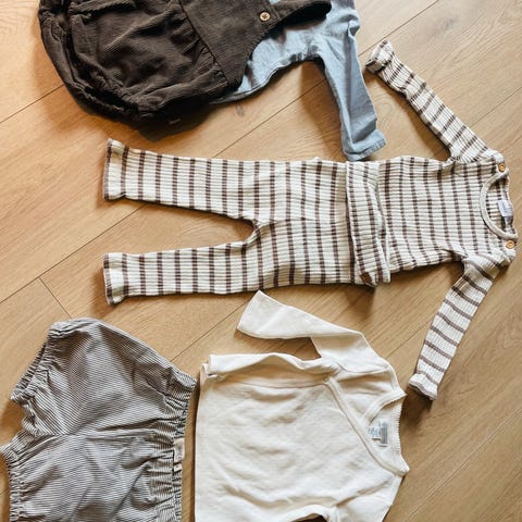 Klespakke som inkluderer ulike plagg som vest, skjorte, bukser, body, sokker, pysjer og fleecedress fra Wheat, HM, Name it og Reflex. Materialer og detaljer varierer mellom plaggene.