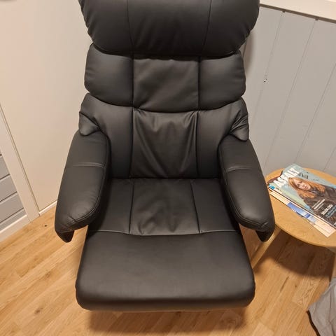 Selger lenestol som jeg fikk i gave. Den ble bestilte på Skeidars nettbutikk, og tidsfrist for retur hadde gått ut da den ble åpnet. Stolen har vært pakket ut og satt samme, prøvesittet og pakket ned igjen i esken. Så er helt ny og ubrukt. Stolen er liten og nett, og passet nok best for personer opp til 170 cm. Regulerer rygg og fotskammel samtidig.