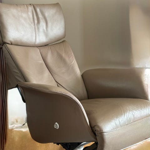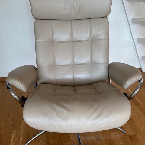 Pent brukt Stressless Metro i kremfarget skinn. Chrome understell. Meget god lenestol. Oppgitte mål er ca, og kan avvike noe.
